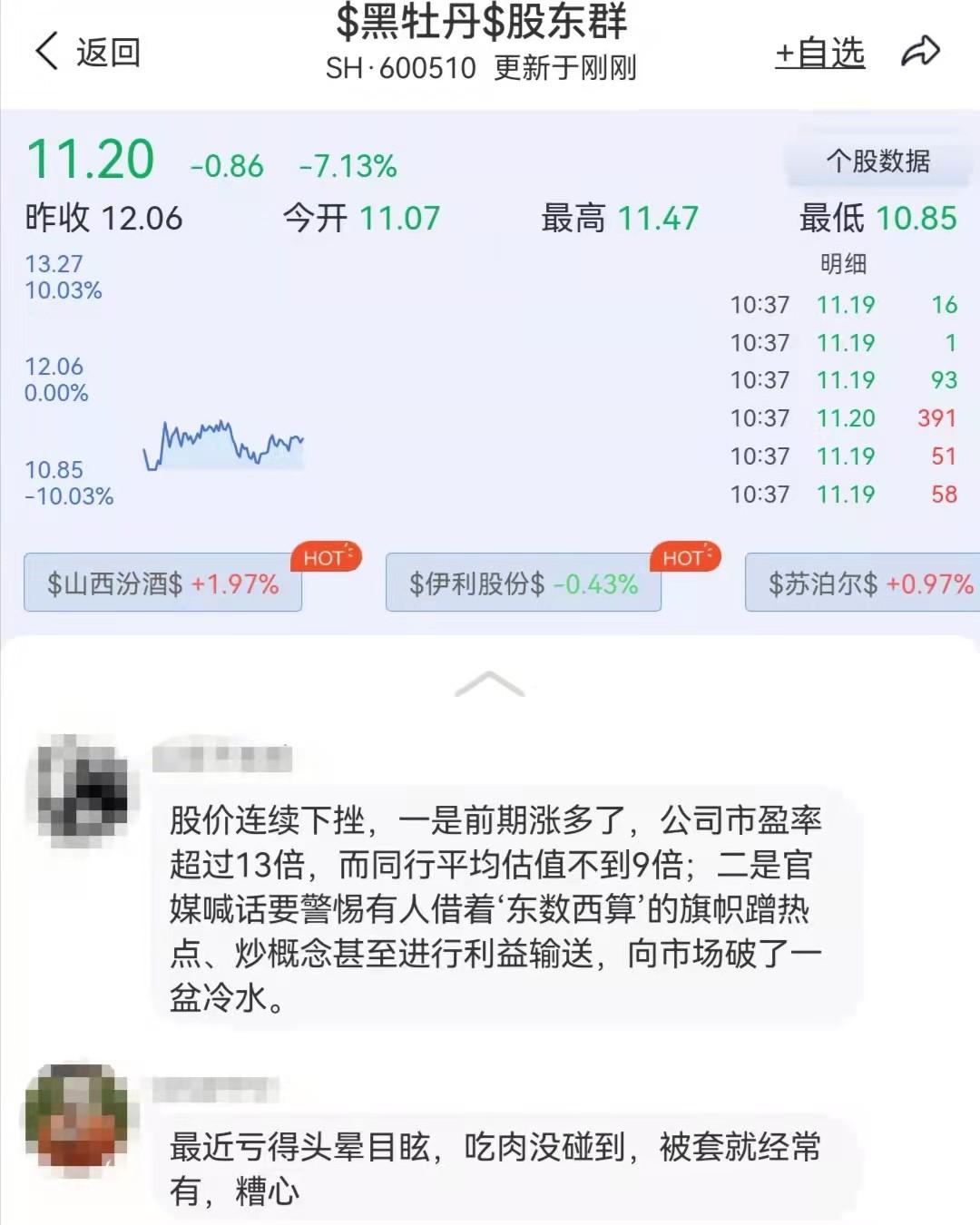 在尺度黑牡丹股东群,有投资者表示,“股价连续下挫,一是前期涨多了,公司市盈率超过13倍,而同行平均估值不到9倍;二是官媒喊话要警惕有人借着‘东数西算’的旗帜蹭热点、炒概念甚至进行利益输送,给市场炒作降温”。