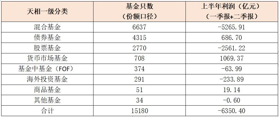 今年上半年,只有债券基金、货币市场基金、商品基金三个分类基金录得正收益。