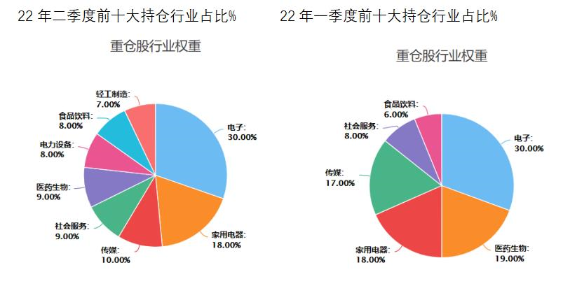 22年一季度和二季度的前十大持仓主要聚焦在电子、医药、家电、传媒方向。