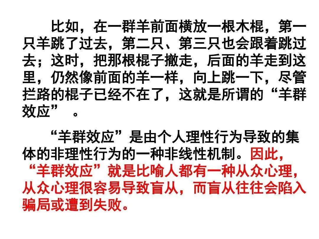 简单来讲,“羊群效应”可以理解为一种从众心理,跟风、随大流,别人干什么,我也干什么。