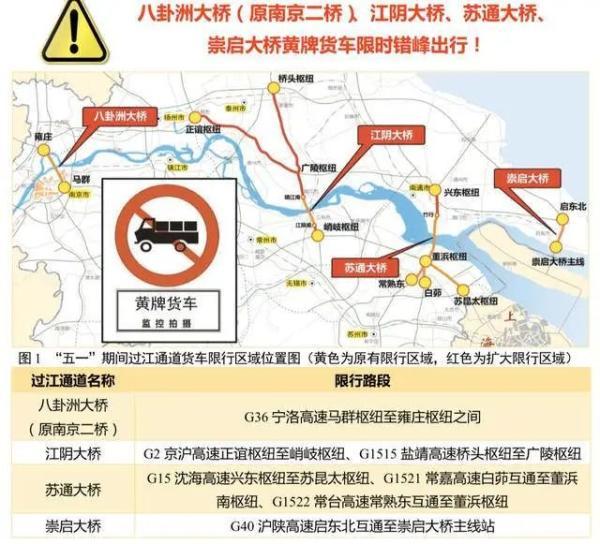 “五一”期间,八卦洲大桥(原南京二桥)、江阴大桥、苏通大桥、崇启大桥继续实施黄牌货车限时错峰出行政策,限行时段有所调整,限行路段有所扩大。限行时段为 4月30日12:00-5 月1日22:00、5月4日和5日每日8:00-22:00,限行路段如图所示。