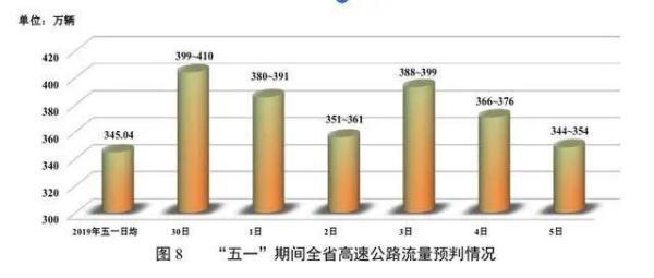 “五一”期间,受所有车辆免费通行政策影响,全省高速公路路网日均出口流量预计达到 366~376 万辆/日,有望创历史新高,同比增长约 6%~9%,较 2019 年日均增长约 70%;受公众提前出行影响,流量最高日预计为 4 月 30 日 (假期前一日),有望达到 399~410 万辆。