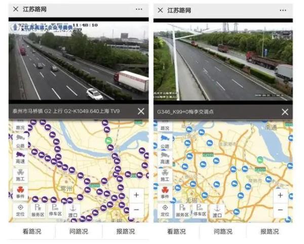 “五一”期间,“江苏路网”官方微信公众号会提供实时路况。只需关注后点击左下角“路况”,4500 路高速公路和 2200 路普通国省道的实时视频上云,为全省公路出行提供实时路况直播。蓝色代表普通国省道视频,紫色则代表高速公路视频。平台同步提供全省公路网施工信息、交通事故,以及服 务区、停车区、渡口等实时信息。