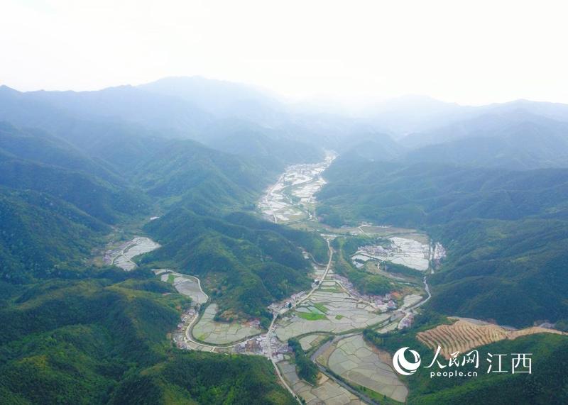 空中俯瞰江西省九江市修水县东港乡岭下村,良好的生态环境和人居环境让当地百姓幸福感满满。 人民网时雨摄