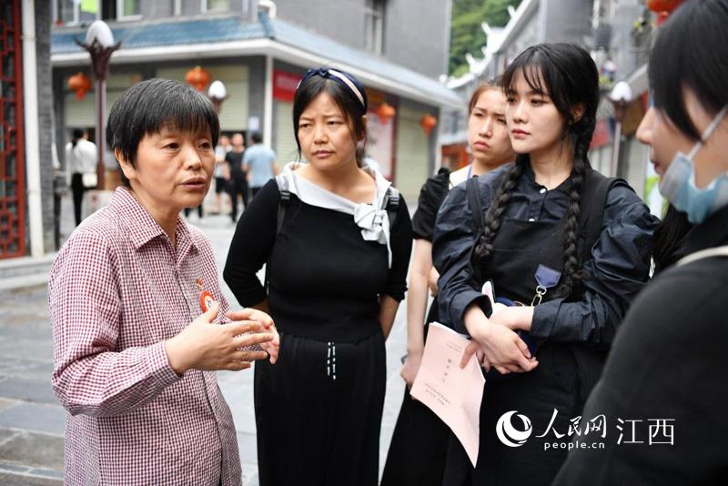 在井冈山上,甘祖昌将军的女儿甘公荣(左)正在向青年游客讲述父亲的红色故事。 人民网 时雨摄