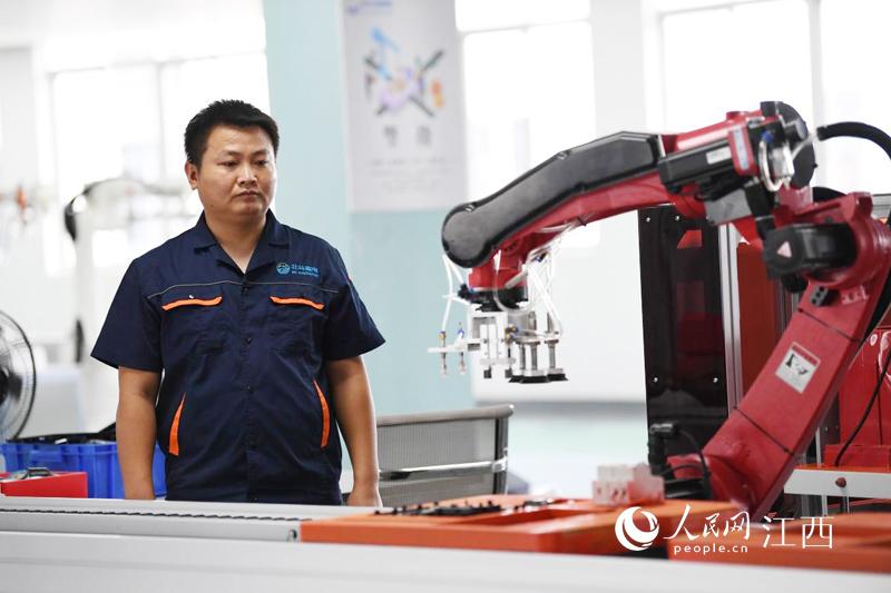 江西省崇仁县一家变电设备企业里,全自动机器人正在流水线上作业。 人民网 时雨摄