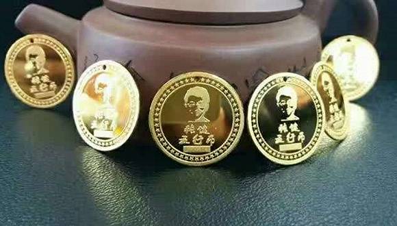 这样的说辞让不少人相信了。下图这个就是五行币,据说纯金制造。一面是头像,刻着张健五行币字样,下面有一组数字编号,另一面是些装饰图案。