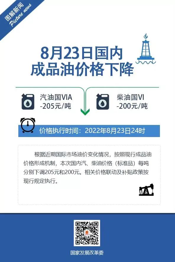 成品油价“五连降”如期兑现。国家发展改革委23日发布消息,根据近期国际市场油价变化情况,按照现行成品油价格形成机制,自2022年8月23日24时起,国内汽、柴油价格每吨分别降低205元和200元。