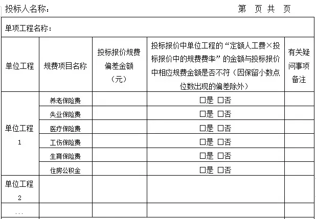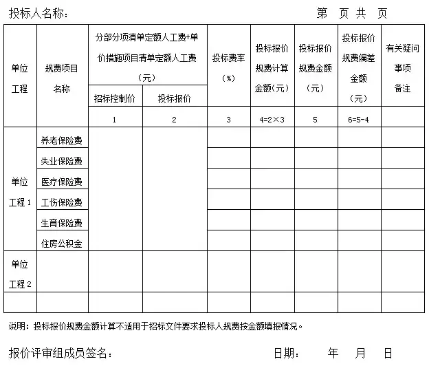 对投标报价中规费明细项目(养老保险费、失业保险费、医疗保险费、工伤保险费、生育保险费、住房公积金)的金额逐项复核,其投标报价中单位工程的“定额人工费(分部分项清单定额人工费+单价措施项目清单定额人工费,下同)×投标报价中的规费费率”的金额与投标报价中相应规费金额不符(因保留小数点位数出现的偏差除外)的,报价评审组应否决其投标。