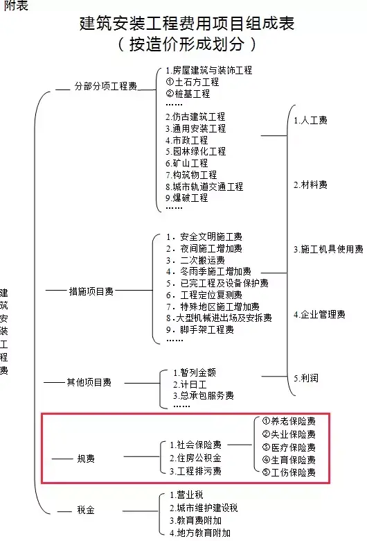 规费是指国家及地方政府规定必须缴纳的费用,一般由工程排污费、工程定额测定费、社会保障费、住房公积金、危险作业意外伤害保险组成。社会保障费分为:养老保险费、失业保险费、医疗保险费、生育保险、工伤保险等。