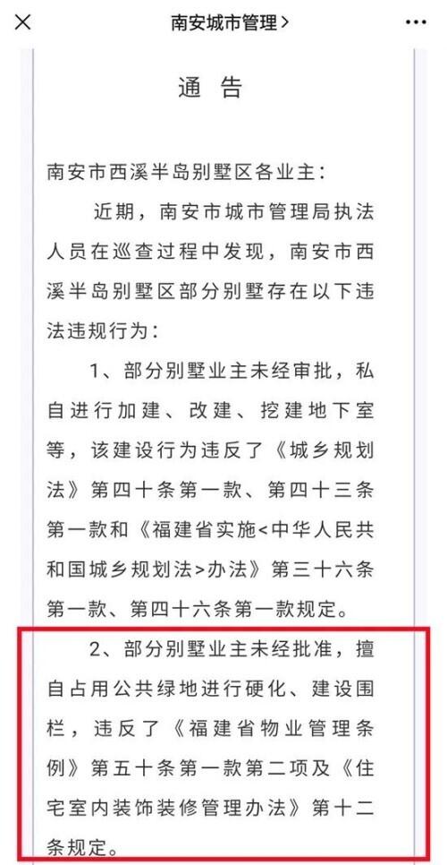 2021年4月9日,南安市城市管理局官方微信公众号发布通告,南安市西溪半岛别墅区部分别墅业主未经批准,擅自占用公共绿地进行硬化、建设围栏,违反相关规定。