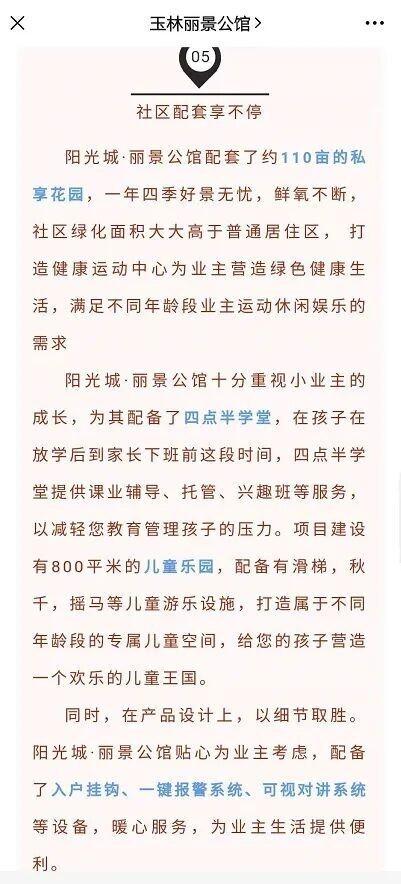 2019年6月12日,玉林丽景公馆微信公众号发文宣称,阳光城·丽景公馆配套了约110亩私享花园、四点半学堂、800平方米儿童乐园。该项目开发商是广西东鼎华光文化投资有限公司,为阳光城集团下属公司。同年10月31日,《玉林晚报》微信公众号也推送了相关广告。