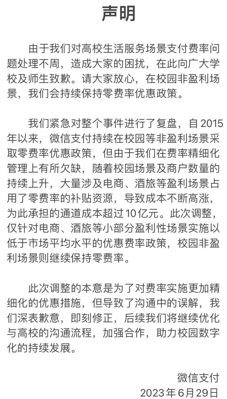 29日,腾讯微信团队官方微博发布声明,表示由于对高校生活服务场景支付费率问题处理不周,造成大家的困扰,在此向广大学校及师生致歉。