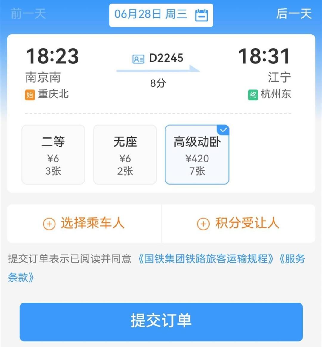6月27日,有江苏网友吐槽,D2245次列车从南京南站至江宁站,乘坐时长8分钟,高级动卧竟售价420元,如果跟二等座票价对比的话(只要6元),这个反差就更明显了,因为价差达到了70倍!
