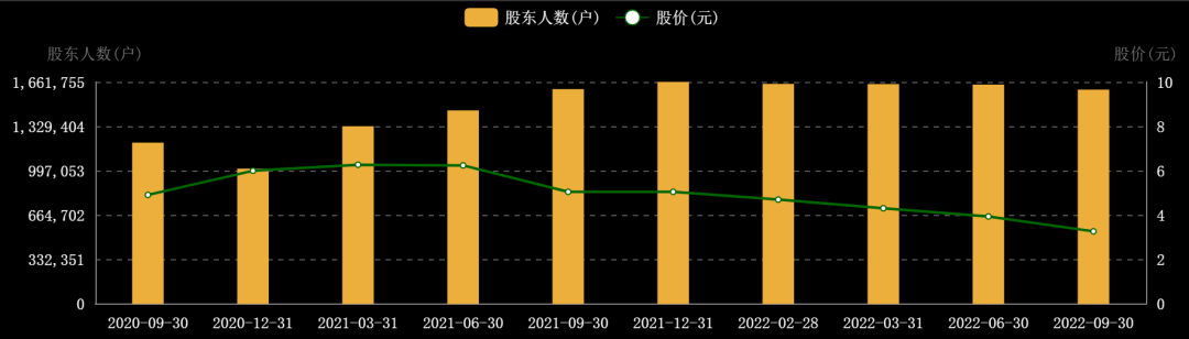 截至2022年12月30日,股价跌去了将近一半,在这一年半的时间里,几乎没怎么上涨,一路下跌,可以想象持有它的投资者该有多煎熬,人均资产缩水一半。