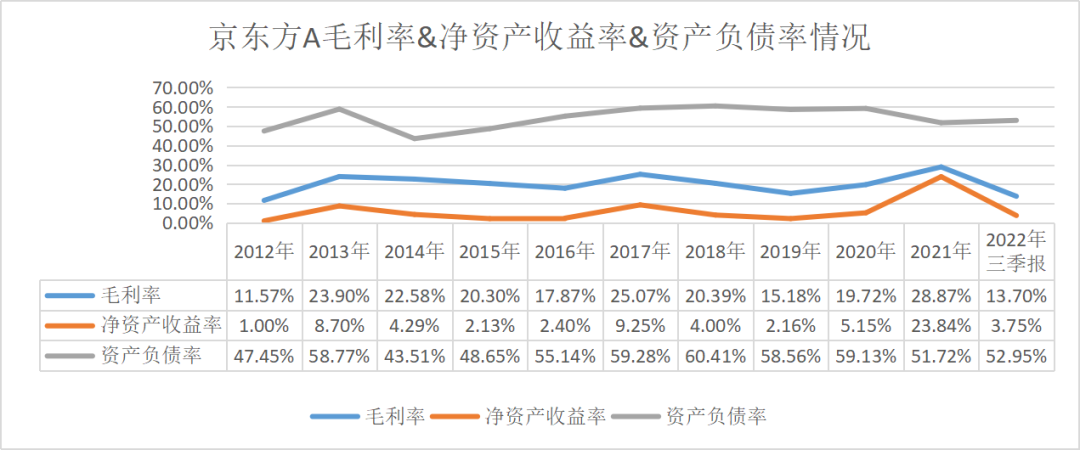 上图是京东方A的2012年到2022年三季报毛利率、净资产收益率以及资产负债率的情况,可以看到毛利率和净资产收益率基本上保持同步的走势,与上面提到的净利润的走势也相似,呈现出周期性的特征。