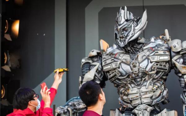 北京环球影城里的“威震天”,又很不一样。用机器感的话语和观众互动调侃,少了黑暗恐怖,多了幽默有趣,