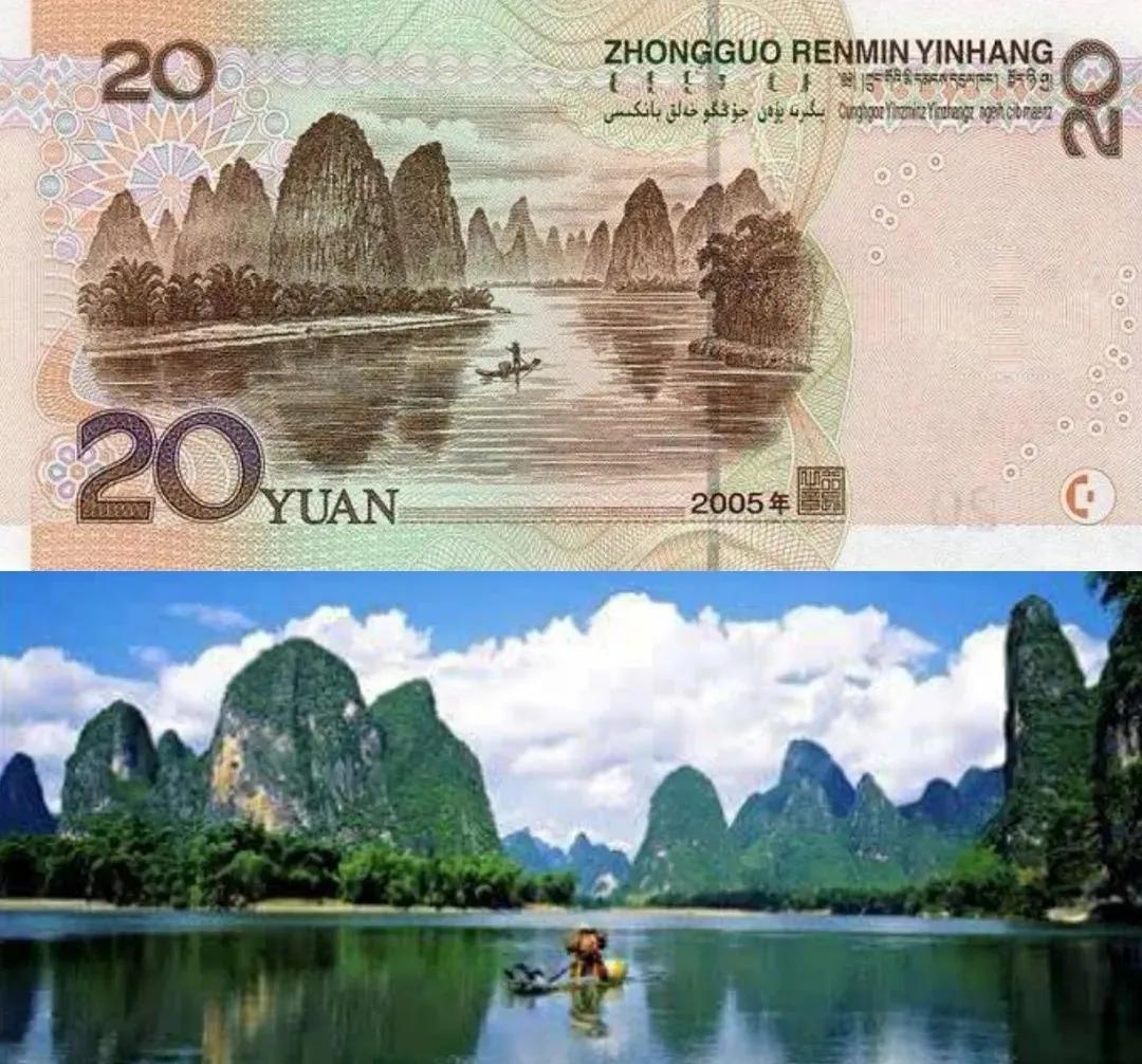 20元的背景图案为桂林山水,“山青”、“水秀”、“洞奇”、“石美”是桂林四绝,一个现实版的世外桃源。桂林山水甲天下,玉碧罗青意可参。这句诗词想必大家都不陌生,桂林是世界著名的风景旅游城市,漓江水清澈秀丽,有着举世无双的喀斯特地貌。