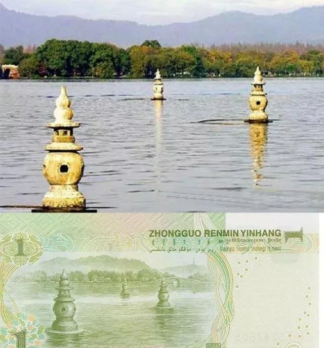 但与其他景色不同的是1元背面人民币上的图案三潭映月并非完全写实,摄影师所在角度只能拍到两座石塔。