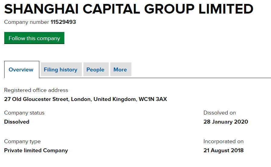 中新经纬客户端在英国的Companies House(英国工商登记)官网查询发现, 徐勤根于2018年8月在英国注册成立了上海资本集团,该公司注册资本仅为1英镑,而公司高管也仅有徐勤根一人,他同时担任公司秘书与董事。不过,该公司已经于2020年1月解散。