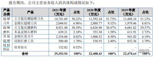 目前,富耐克的主要产品分为超硬磨料、超硬刀具和其他超硬材料制品。报告期内,以立方氮化硼磨料和立方氮化硼超硬刀具作为核心产品的合计收入各年占比分别为80.49%、82.2%和80.61%。