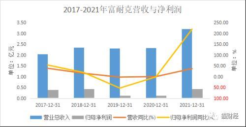 财务方面,2019-2021年,富耐克的营业收入分别为2.32亿元、2.34亿元和3.21亿元,归母净利润分别为1380.1万元、1371.98万元和4388.41万元。由此可以看出,最近五年,虽然富耐克的营业收入总体呈上升趋势,但2018年至2020年净利润却出现断崖式下滑。