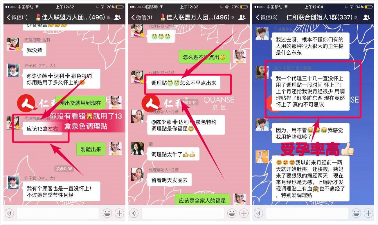 还有代理发出的产品相关群聊天记录称,调理贴能解决患者输卵管堵塞的问题,帮助患者成功怀孕。