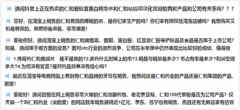 巧的是,今年1月,天津市公安机关对权健自然医学科技发展有限公司涉嫌组织、领导传销活动罪和虚假广告罪立案侦查;同一时期,不少网友在仁和药业的投资者交流平台发帖提示股民注意仁和涉传被查的风险。