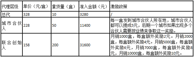 每个级别的代理,拿货价差分别为100元、70元,最低级别的总代零售一盒产品可以赚到170元差价,最高级别的联合创始人则可以赚到340元。