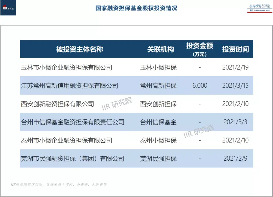 国家融资担保基金主要定位于助力小微企业和“三农”发展,截至2020年11月20日,首批12家机构的股权投资协议落地。截至目前,基金已对外投资6家融资担保有限公司。
