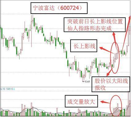 仙人指路的前一天,通常会出现大阳线,并伴有大的成交量。说明主力有上攻的愿望。