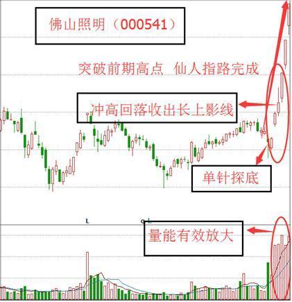仙人指路出现在拉升波段的中期,则是主力在盘中展开强势洗盘的操盘动作。