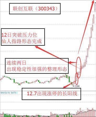 如下图所示:联创互联在2012年12月7日出现涨停的长阳线,在随后的12月10日、11日连续2日出现稳定很强整理形态,并在12日一举消化前期压力区域,是典型的仙人指路K线形态,是很好的短线买进机会。