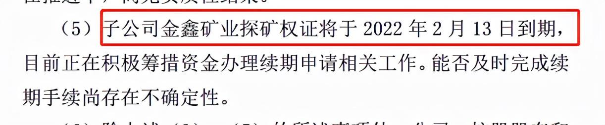 三、金鑫矿业探矿权证将于2022 年2月13日到期,目前正在积极筹措资金办理续期申请相关工作。能否及时完成续期手续尚存在不确定性。
