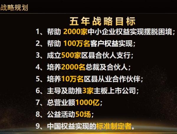 此外,“权行普惠”不但拟“成立500家区县合伙人支行”“培养2000名总裁及合伙人”“培养10万名区县从业合作伙伴”,还制定了“主导及助推3家主板上市公司”的愿景。