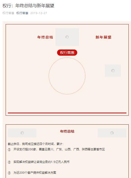 账号主体同样为权行普惠运营公司的另一微信公众号“权行普惠”曾于2019年12月27日发布了一篇文章,文章中称,该公司当时已“实现解决权益转让咨询业务约1.5亿元人民币”,“为近200名客户提供了权益解决方案”。