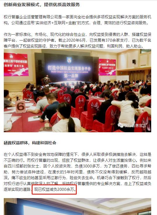 该公众号另一篇文章还列举了一则案例,称权行普惠运营公司通过提供专业解决方案,为一名负债3000多万的女子“权益减负2000余万”。