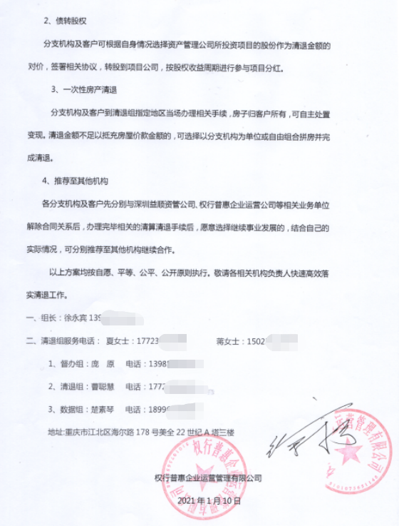 后来,这位贵州男士与周英联系上了,又抱有了希望。因为周英告诉他,只是有关部门禁止了“权行普惠”的“解债”业务,权行普惠方面会逐一退款。