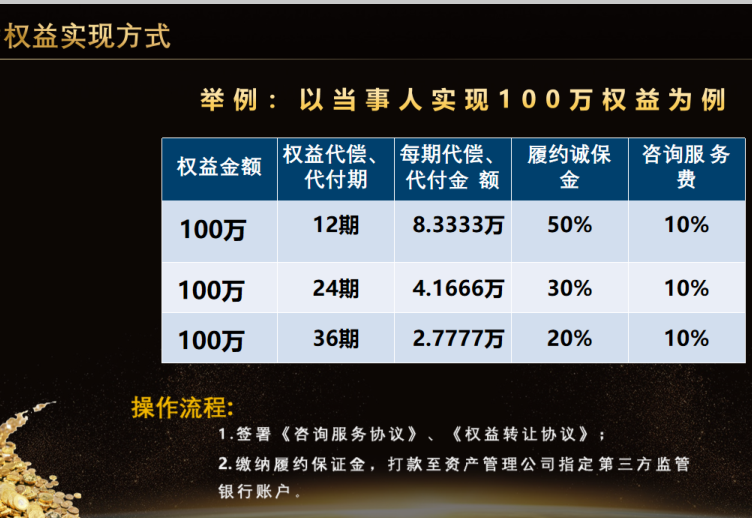 1.2如果是分24期(2年)还100万,出借人每月收到权益金4.1666万元。出借人或借款人须缴纳:履约保证金30万元+咨询服务费10万=40万元;