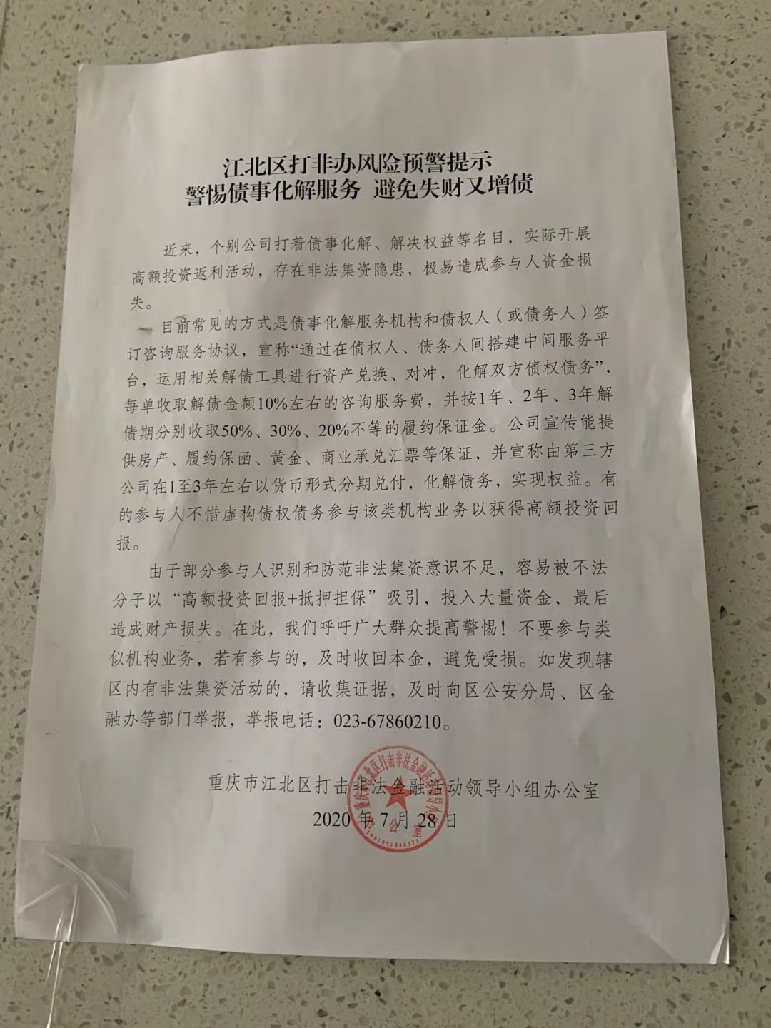 每经记者于2020年11月中旬在现场调查时看到,在“权行普惠”总部所在办公楼通往其办公室的电梯口斜对面公告栏,江北区打击非法金融活动领导小组办公室张贴了《警惕债事化解服务 避免失财又增债》的风险预警提示,不过,该提示没有点名“权行普惠”。