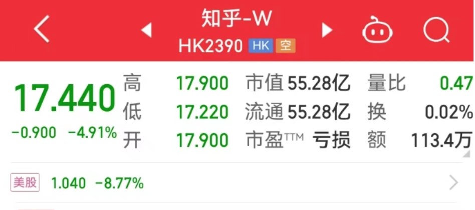 知乎港股股价报收17.44港元,跌近5%,美股股价报收1.04美元,大跌超8%