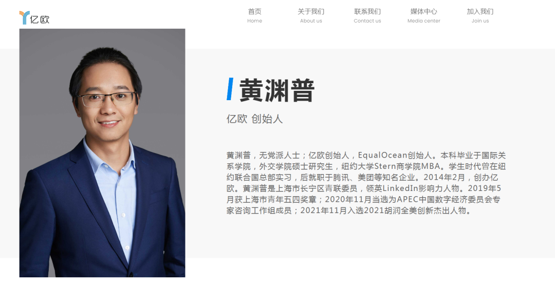 据亿欧网介绍,黄渊普,无党派人士;亿欧创始人,EqualOcean创始人。本科毕业于国际关系学院,外交学院硕士研究生,纽约大学Stern商学院MBA。学生时代曾在纽约联合国总部实习,后就职于腾讯、美团等知名企业。2014年2月,创办亿欧。