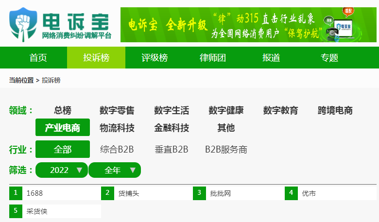 据国内知名网络消费纠纷调解平台“电诉宝”(315.100EC.CN)数据显示,2022全年产业电商领域投诉依次为:1688、货捕头、批批网、优市、采货侠。此前,也曾收到过网商园、中国网库、衣联网、新鬼科技、进货通、互站网等类似平台投诉。
