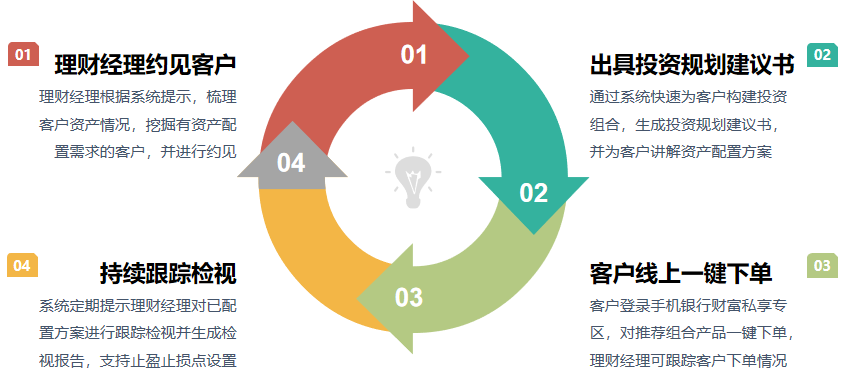 理财经理在全面了解客户的基础上,借助于个人财富管理系统,形成“理财经理约见客户—为客户出具建议书—客户在手机银行查看建议书—持续跟踪检视客户资配需求”的资产配置全流程闭环。同时,系统可将投研人员的观点直接触达理财经理与客户。让客户既能在线下感受“有温度”的专人服务,又能在线上体验便捷的资产配置专业服务。