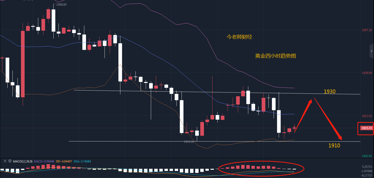 短线上从4小时图来看,金价虽有反弹的迹象,但空头趋势排列很好,所以反弹只是为了让我们继续做空,日内压力首先关注金价最后一次反抽的高点1920位置,这是日内第一做空点位,其次就是1924位置,上方短期重点关注1925-1930一线阻力,下方短期重点关注1905-1900一线支撑。