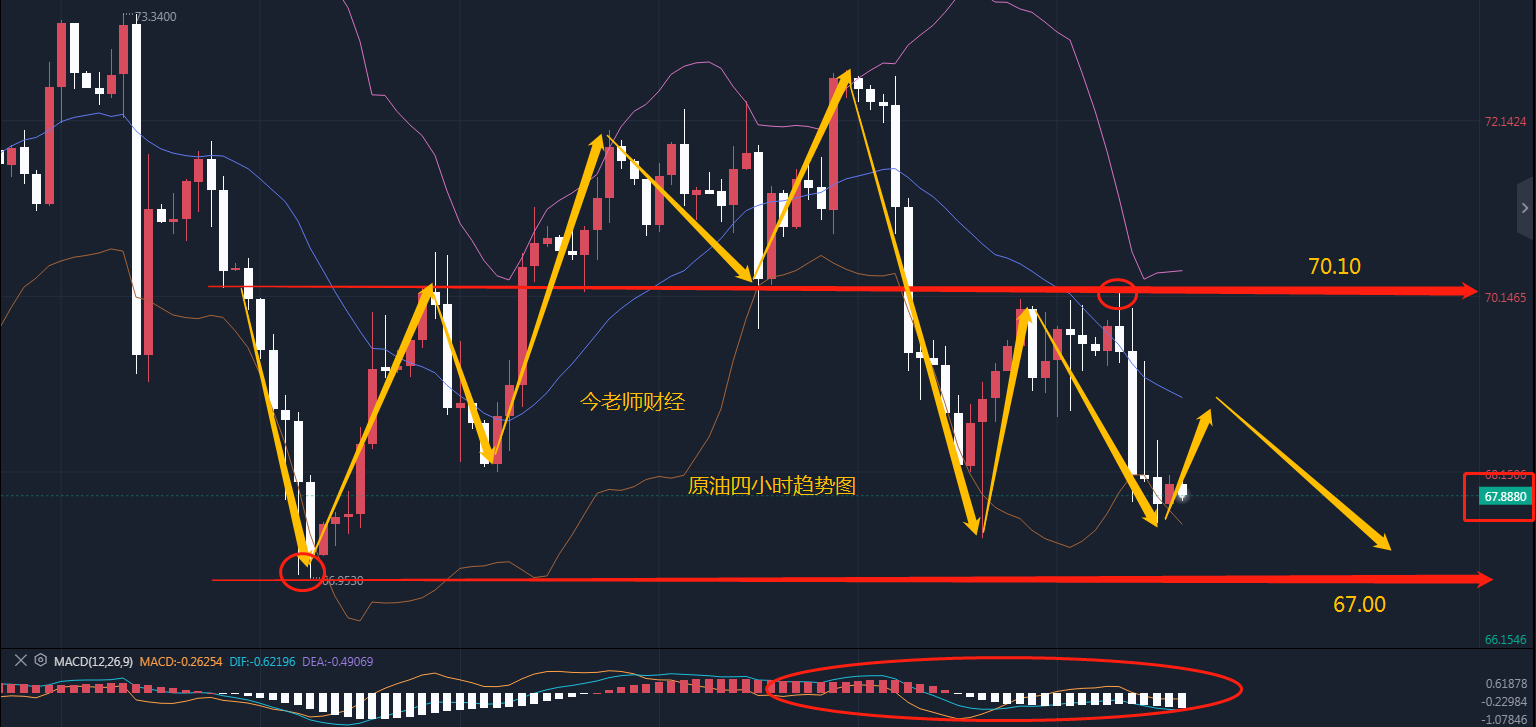 :原油昨日十字K线窄幅整理收盘,空间收缩较小,最低67.81位置,最高70.19位置.基本符合昨日的预期。短线先行延续上探,但空间相对略小了一点。只是在区间内收缩拉锯,并没有强势摸高。日线级别显示,油价连续的震荡K线调整中,一直在67.00上方形成支撑,表现出弱调格局中,整体趋势偏空。小级别趋势上看,布林带开口向右走平,油价在上下轨之间来回徘徊中,如果不能出现延续的向上突破,很难改变偏空格局。4小时力有处于下轨反弹至中轨附近小有承压。短线箱体区间下轨受到支撑。有向上轨反弹之迹象,不过昨日动能不足,中轨处承压陷入收缩震荡,短期结构并看不出单边突破,暂时维持区间内高空低多。由于空间时大时小,更考验进场点位。小方向则是卡住日内的小区间卡点切入,原油上方短期重点关注70.10一线阻力,下方短期重点关注67.00一线支撑。