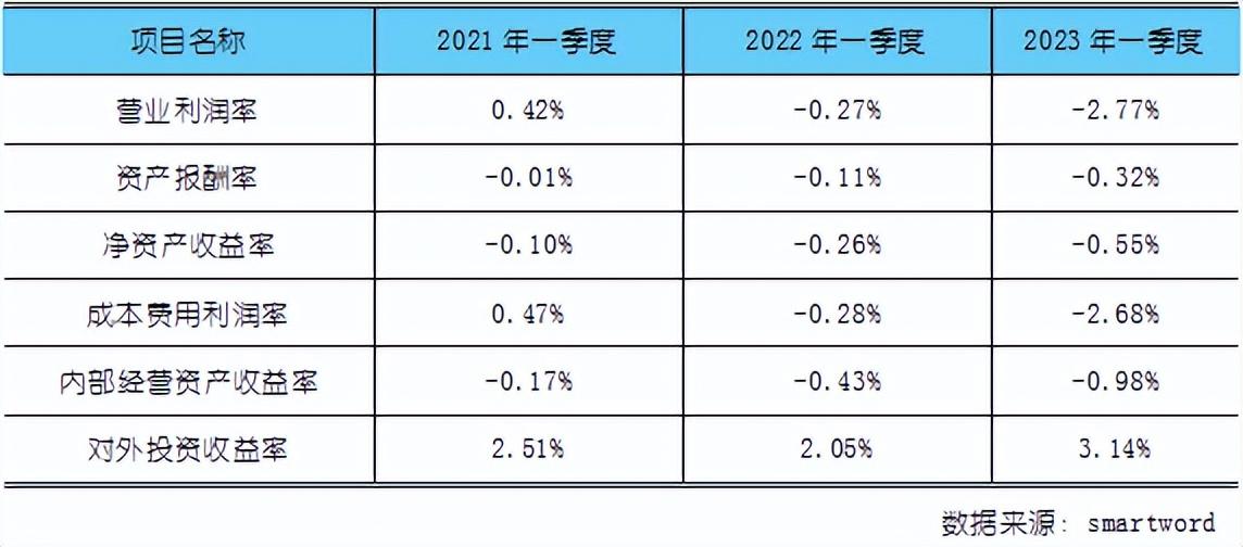 南京熊猫电子股份有限公司2023年一季度的营业利润率为-2.77%,资产报酬率为-0.32%,净资产收益率为-0.55%,成本费用利润率为-2.68%。公司实际投入到自身经营业务的资产为461,989.17万元,内部经营资产收益率是-0.98%,对外投资的收益率是3.14%。