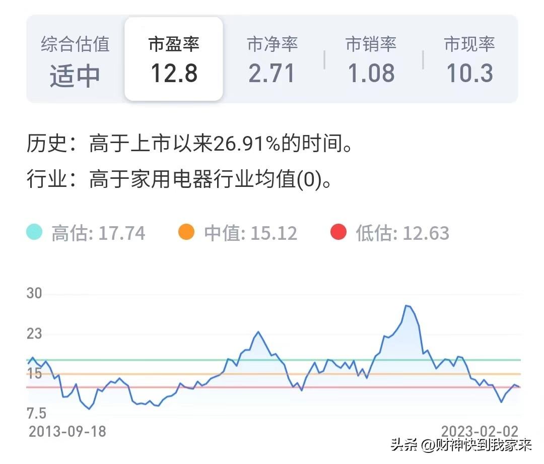 如下图是美的集团历史PE(TTM)的趋势,从图中可以看出,PE超过17.74时属于高估区间,PE低于12.63时属于低估区间,其它为正常估值区间,当PE进行低估区间(小于12.63)时即可开始重点关注了。
