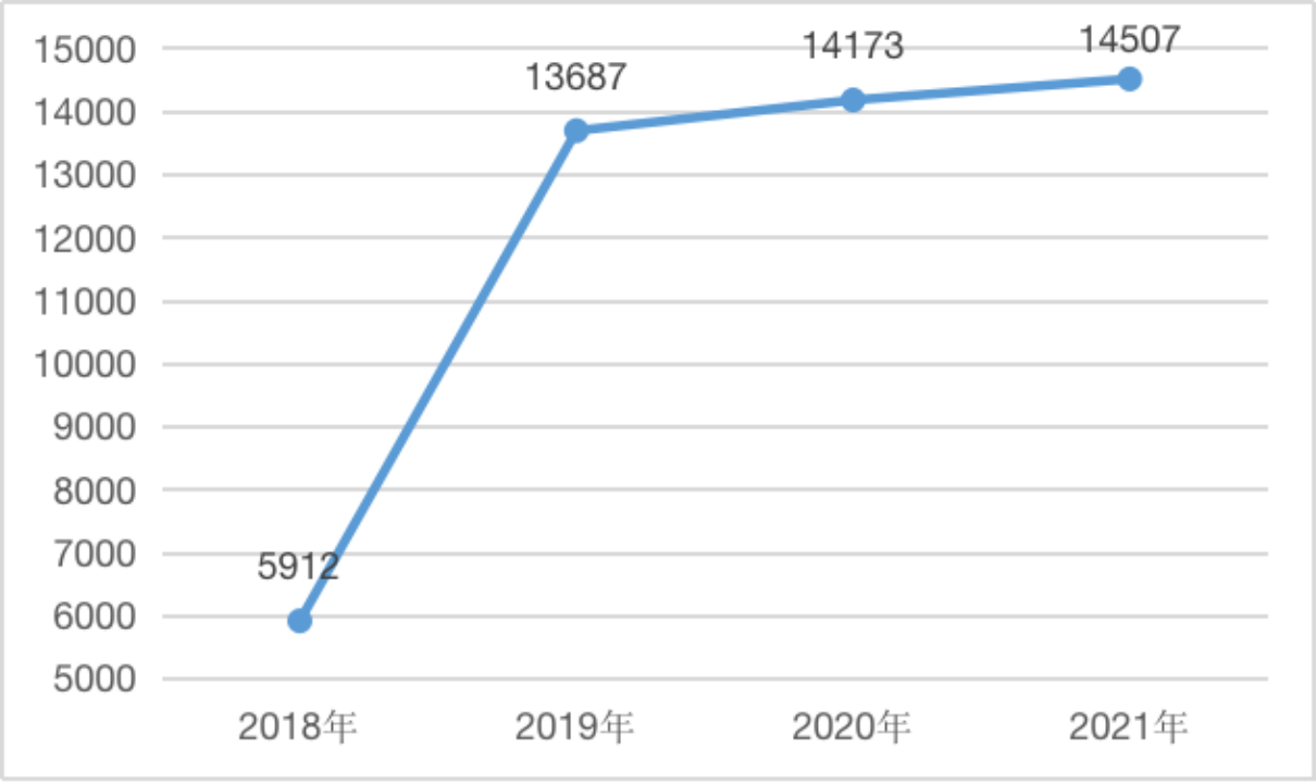 一汽富维2018-2021年员工总人数分别为5912人13687人、14173人和14507人。2019年较2018年公司员工人数扩大了1.32倍,2019-2021年平均每年增长410人,可以看出公司规模比较庞大,为适应生产经营需要扩大了员工规模。