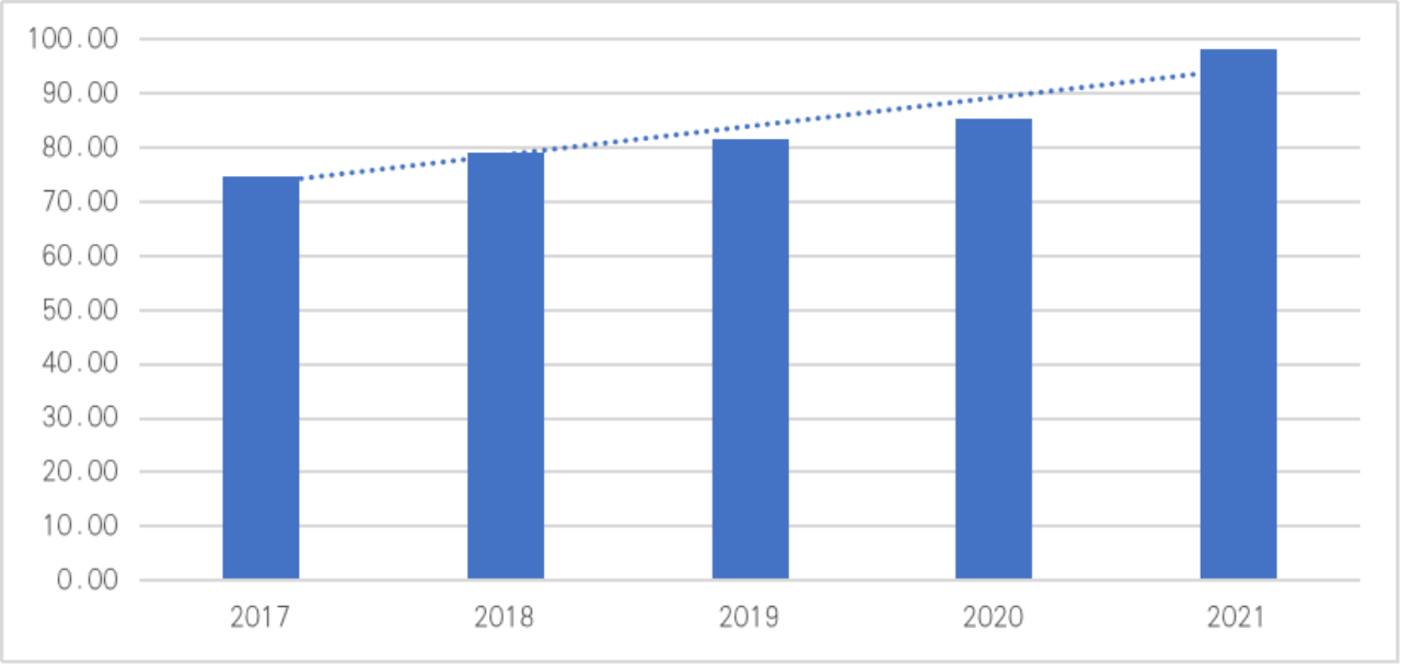 双环传动2019-2021年总资产分别为81.60亿元、85.31亿元、98.23亿元(图1)。尽管疫情对经济影响较大,但从近五年的资产总额增长趋势来看,双环传动总资产持续增加,2020年较上年增长4.55%,2021年较上年增长15.15%。